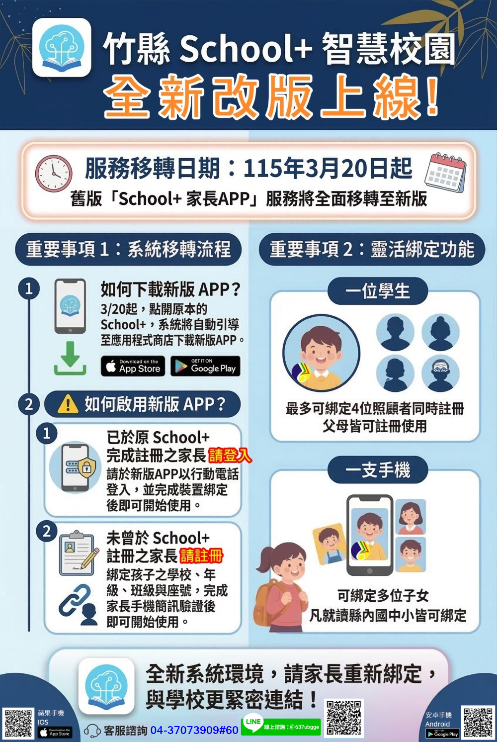 自3月20日起,所有模組功能、訊息推播等服務將全面移轉至新竹縣專屬教育 APP 使用。